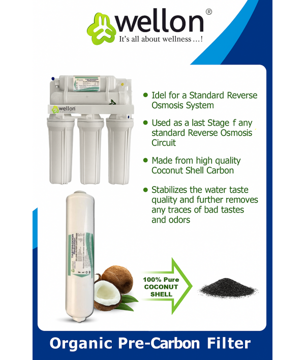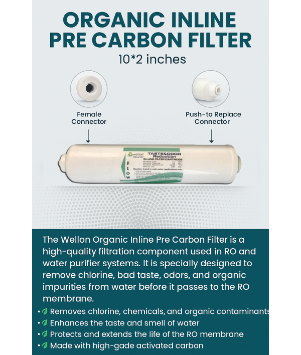 Enhance your RO water purifier’s performance with the Wellon Organic Pre Carbon Filter. This 10" inline filter effectively removes bad taste, odor, chlorine, and organic impurities. Designed for universal RO systems, it ensures cleaner, better-tasting drinking water with long-lasting filtration. Ideal for home and commercial use.