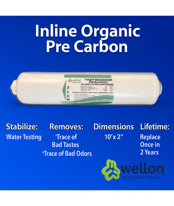 Upgrade your water purification system with the Wellon Organic Pre Carbon Filter. This high-performance 10-inch inline filter uses premium coconut shell activated carbon to effectively remove chlorine, bad taste, odor, and organic impurities from your water. Designed for compatibility with most RO systems, it ensures cleaner, fresher-tasting drinking water. Ideal for both domestic and commercial RO setups, it’s easy to install and built for long-lasting performance.
