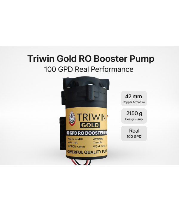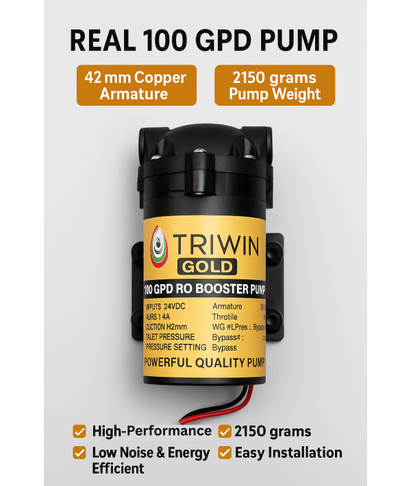 The Triwin Gold 100 GPD RO Booster Pump is a premium-quality, heavy-duty pump engineered for reliable and powerful water pressure in RO water purification systems. Built with a 42 mm copper armature and weighing 2150 grams, this pump ensures real 100 GPD performance with unmatched durability. Designed for both domestic and small commercial RO systems, it delivers stable pressure, faster filtration, consistent pure water, and longer RO membrane life.