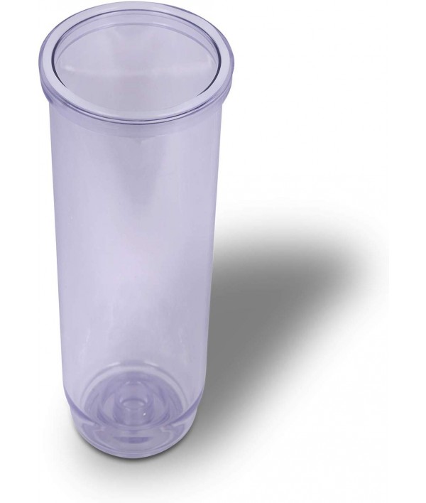 The transparent housing body is made of reinforced polypropylene for strength and resistance to chemicals, and the blue cap and ring are made of high-flow polypropylene for toughness.