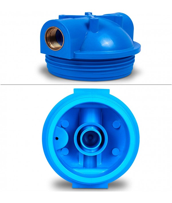 The blue cap has 1 Inch ports which allowed better sealed connections to the corresponding pipes. There is rubber O-ring on the top of the housing body to ensure a watertight seal. A pressure relief button on the inlet side of the cap releases pressure in the housing for changing filter cartridges.