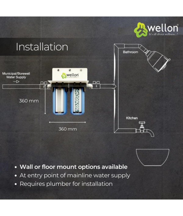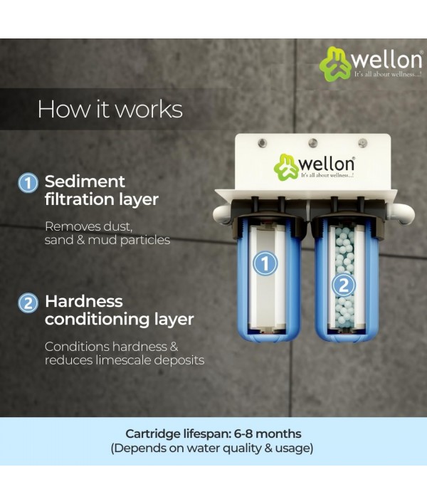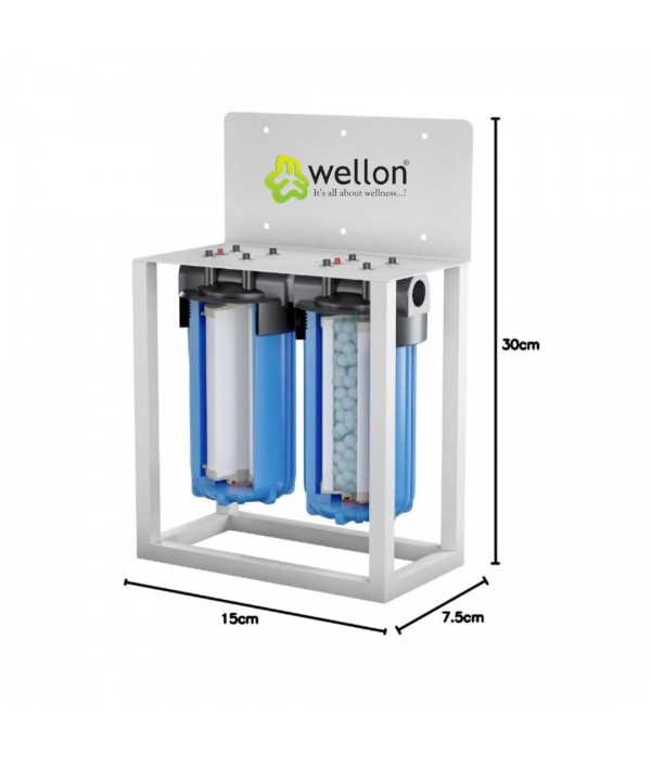 The Wellon Two Stage 10-Inch Mainline Hard Water Filter is a compact and efficient water filtration system designed specifically for small homes, such as 1BHK apartments, facing high levels of sediment in their water supply. This product serves as a whole-house water filtration solution, ensuring clean and softened water for all household needs. Here's an overview: