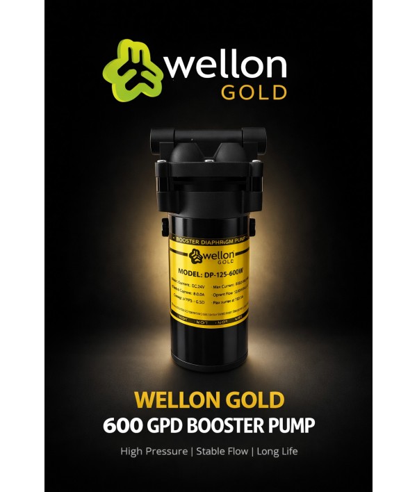 Wellon Gold 600 GPD Booster Pump (Model DP-125-600W) is a high-performance 24V DC diaphragm pump specially engineered for domestic and commercial RO water purification systems. It is designed to deliver stable and consistent pressure required for efficient membrane performance in 600 GPD systems.