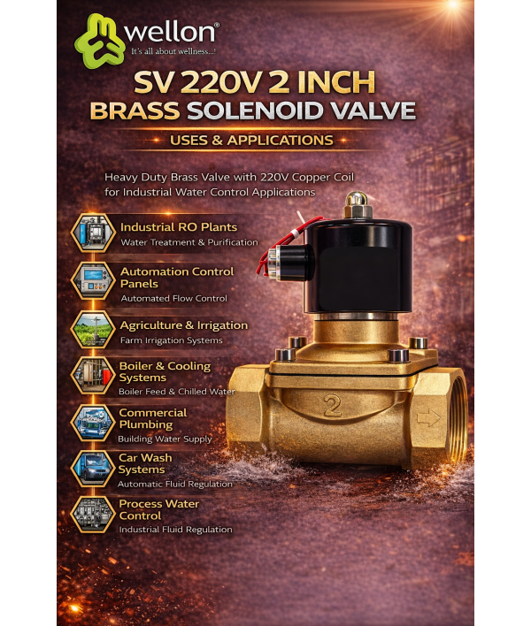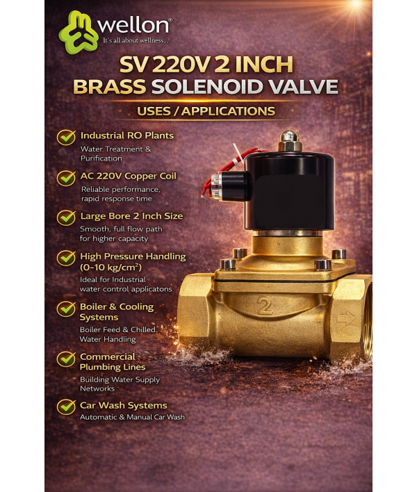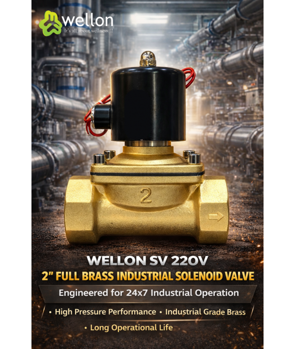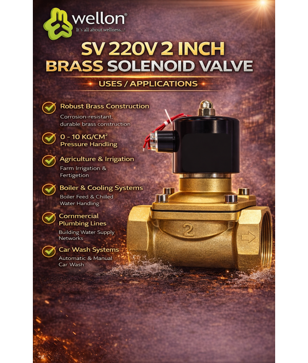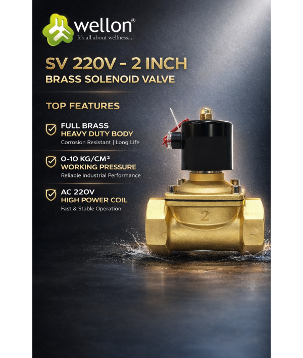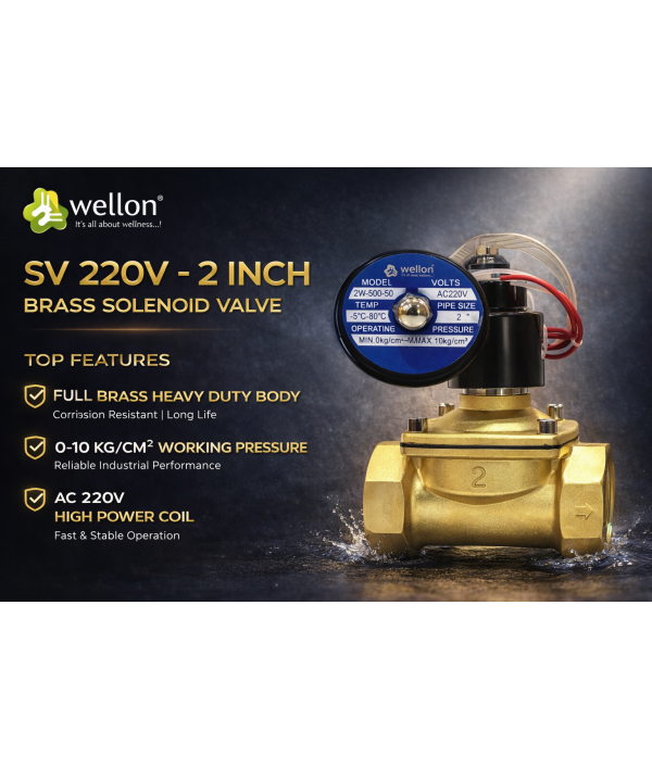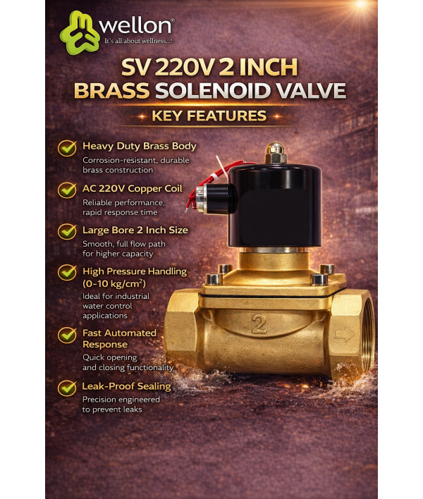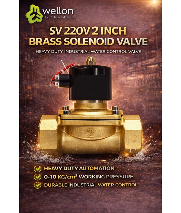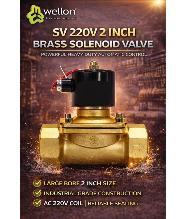 The Wellon SV 220V 2 Inch Brass Solenoid Valve is a heavy duty industrial water control valve designed for automatic and reliable flow regulation. It features a full brass body for strength and corrosion resistance, along with a high performance AC 220V coil for stable and fast operation.