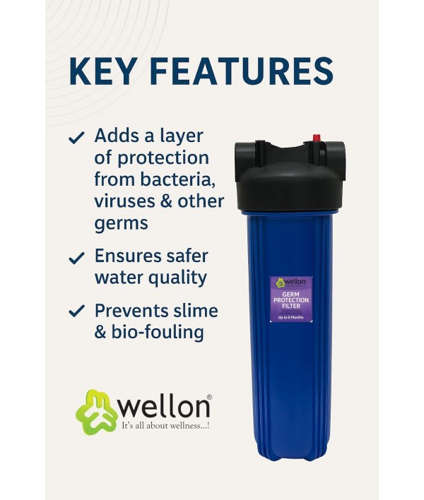 Wellon Germ Protection Filter is a specialized 20” cartridge designed for whole house filtration. It effectively removes bacteria, fungi, and microbial impurities, ensuring safe and hygienic water throughout your home.