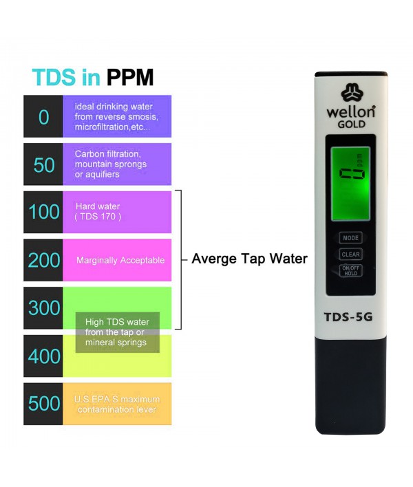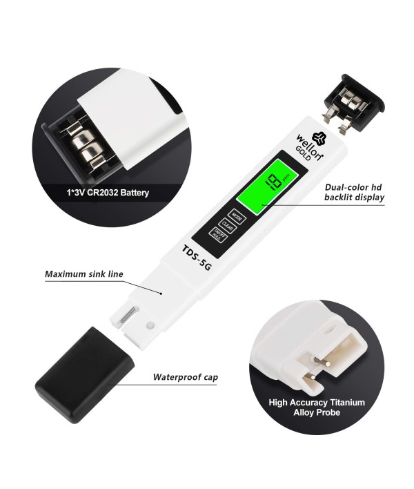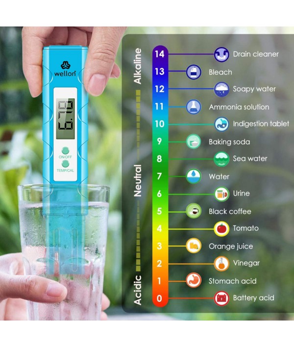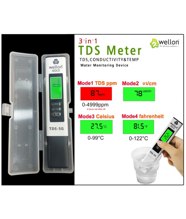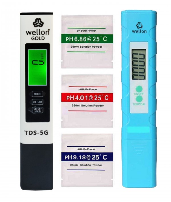 pH meter : ✔ Range 0 to 14 Big Screen Display✔ Accuracy: 0.01 pH ✔ ATC : 0°C - 80°C pH meter : ✔ Gives you accurate information. ✔ 5 Minutes Auto Shot Off Function TDS Meter : Gold 3 in 1 TDS Meter TDS, Productivity & Temp Water Monitoring Device TDS Meter : Measuring Range -1) TDS:0~9990ppm, 2)Conductivity : 0~9990 us/cm ✔ Calibration : Factory Calibrated ✔ Easy to check Wellon Gold 3 in 1 TDS Meter TDS, Productivity & Temp Water Monitoring Device Measuring Range -1) TDS:0~9990ppm, 2)Conductivity : 0~9990 us/cm Calibration : Factory Calibrated Auto shut off - 5 Minutes, Accuracy : +-0.1C, Temperature:0-99 C & 32-212 F Smart Function : Auto checking & lock, TDS40ppm -Red Light ✔ Range 0 to 14 Big Screen Display ✔ Accuracy: 0.01 pH ✔ ATC : 0°C - 80°C ✔ Gives you accurate information. ✔ 5 Minutes Auto Shot Off Function ✔ Easy to check ✔ This PH Meter is already calibrated. You can directly use it.