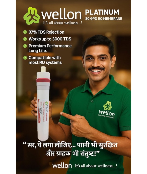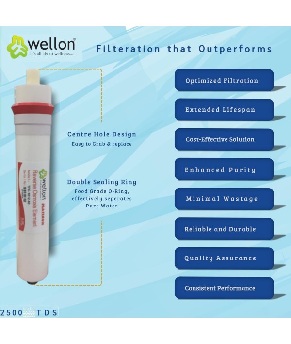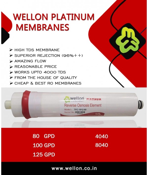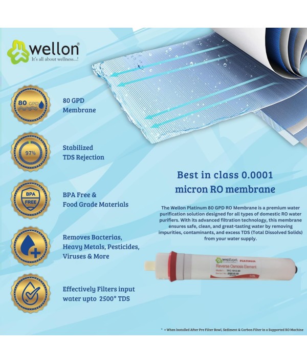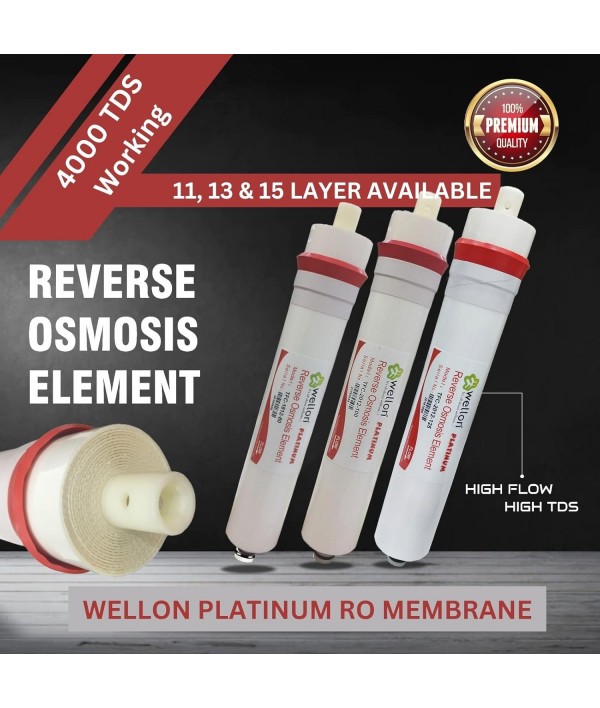 Wellon Platinum RO Membrane is a high-performance reverse osmosis membrane designed for all domestic RO water purifiers. With a purification capacity of 80 GPD (gallons per day) and the ability to handle input water with up to 2500 TDS (Total Dissolved Solids), this membrane ensures consistent and reliable purification, even in challenging water conditions.